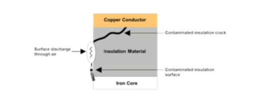 絕緣表面也會(huì)發(fā)生局部放電。二手旋轉(zhuǎn)設(shè)備通常在絕緣層的外面有一層污染層。如果絕緣表面上的這種“污垢”或水分不均勻或不連續(xù),則表面可能會(huì)放電。如下圖所示,如果從導(dǎo)體到絕緣體表面存在污染的絕緣裂紋或高導(dǎo)電路徑,則尤其如此。
