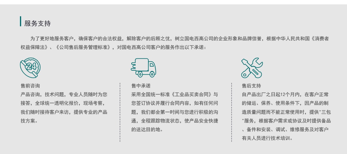 自產(chǎn)品出廠之日起12個(gè)月內(nèi),在客戶正常 的儲(chǔ)運(yùn)、保養(yǎng)、使用條件下,因產(chǎn)品的制 造質(zhì)量問題而不能正常使用時(shí),提供"三包 "服務(wù),根據(jù)客戶需求或協(xié)議及時(shí)提供備品 、備件和安裝、調(diào)試、維修服務(wù)及對(duì)客戶 有關(guān)人員進(jìn)行技術(shù)培訓(xùn)。