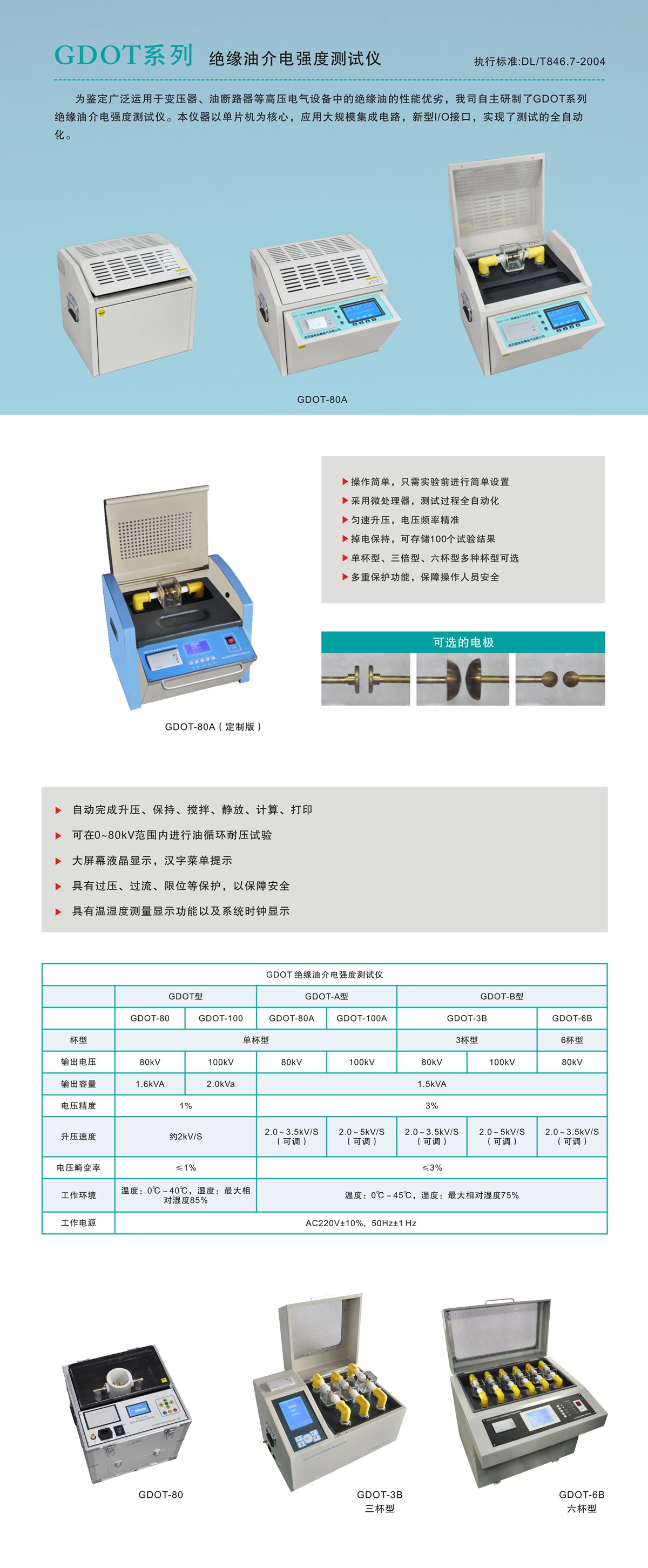 在電力系統(tǒng)、鐵路系統(tǒng)及大型石油化工廠礦,企業(yè)都有大量的電氣設備,其內(nèi)部絕緣大都是充油絕緣型的,絕緣油的介電強度是必測的常規(guī)試驗。為適應市場需要,我公司依據(jù)國家標準GB/T507-2002、行標DL429.9-91以及最新的電力行業(yè)標準DL/T846.7-2004自行研發(fā)、生產(chǎn)了系列絕緣油介電強度測定儀。本儀器以單片微計算機為核心,實現(xiàn)了測試全部自動化,測量精度高,極大的提高了工作效率,同時也大大減輕了工作人員的勞動強度。
