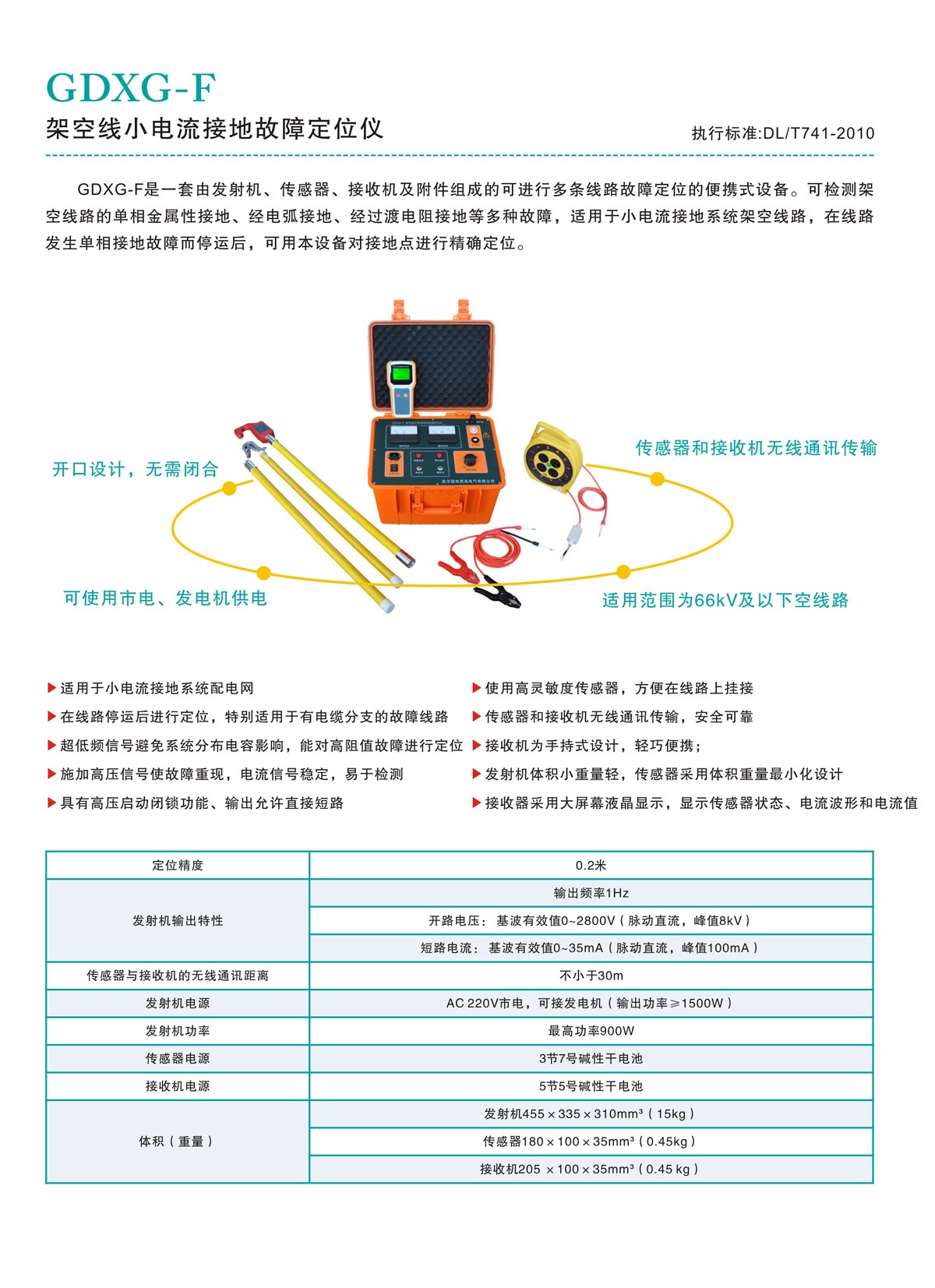 GDXG-F是一套便攜設(shè)備,可進(jìn)行多條線路的故障定位。整套設(shè)備由發(fā)射機(jī)、傳感器、接收機(jī)及附件組成。在故障線路停運后,由發(fā)射機(jī)向線路施加超低頻高壓信號使故障重現(xiàn),在線路沿途用絕緣桿將傳感器掛在線路上檢測信號,并通過無線方式向地面上的接收機(jī)傳輸數(shù)據(jù),接收機(jī)顯示測量結(jié)果。在故障點前,電流持續(xù)存在,故障點后,電流消失??上冗M(jìn)行粗略分段,再精確定點,從而快速確定故障位置。