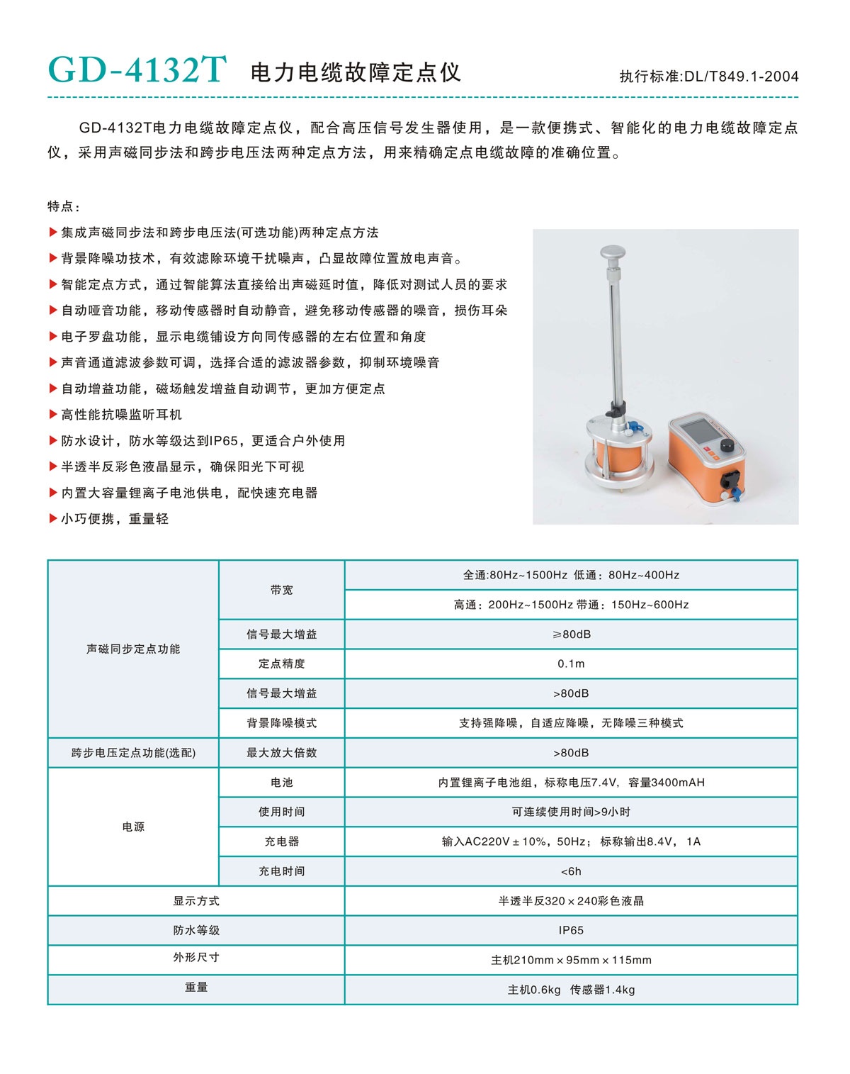 GD-4132T電力電纜故障定點儀,配合高壓信號發(fā)生器使用,是一款便攜式、智能化的電力電纜故障定點儀,采用聲磁同步法和跨步電壓法兩種定點方法,用來精確定點電纜故障的準(zhǔn)確位置。