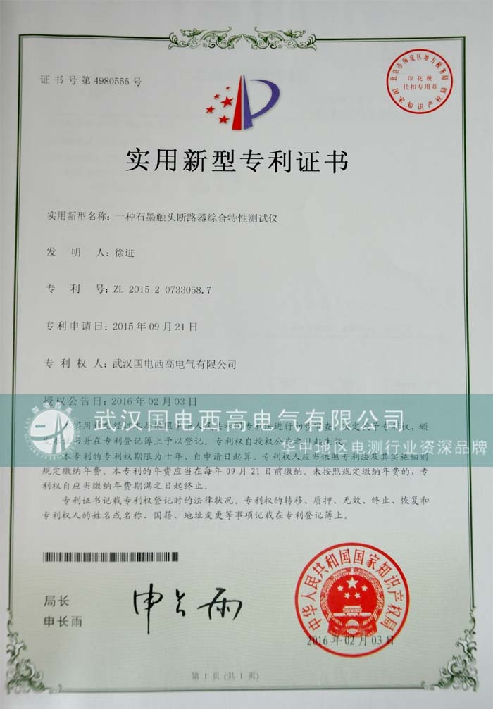 2016年8月10日,武漢國電西高電氣有限公司榮獲中華人民共和國國家知識(shí)產(chǎn)權(quán)局頒發(fā)的“一種步進(jìn)式絕緣電阻測(cè)試裝置”和“一種石墨觸頭斷路器綜合特性測(cè)試儀”兩項(xiàng)實(shí)用新型專利證書,在此我們表示熱烈的祝賀。
