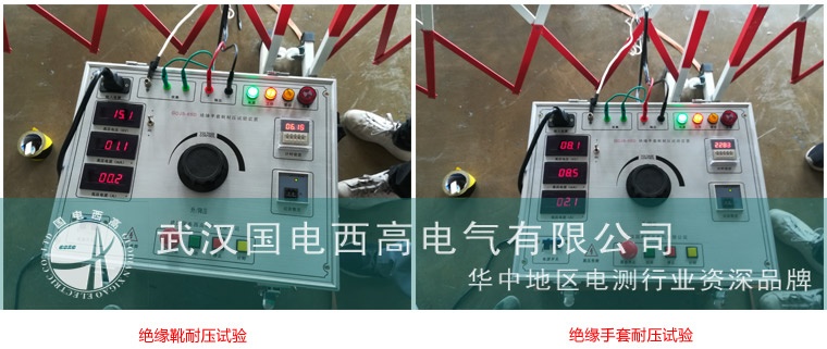 GDJS-65D絕緣手套靴耐壓試驗(yàn)裝置對規(guī)格12kV絕緣手套、25kV絕緣靴的被試品分別升壓8kV和15kV,兩套被試品泄露電流均在合格范圍之內(nèi)。