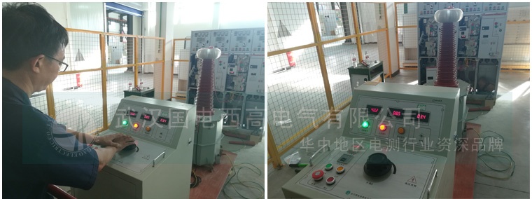隨后,用其購(gòu)買(mǎi)的GDYD-15/150工頻耐壓試驗(yàn)裝置對(duì)現(xiàn)場(chǎng)的10kV開(kāi)關(guān)做耐壓試驗(yàn)??蛻?hù)按照標(biāo)準(zhǔn)升壓至42kV一分鐘無(wú)閃絡(luò),試驗(yàn)通過(guò)!