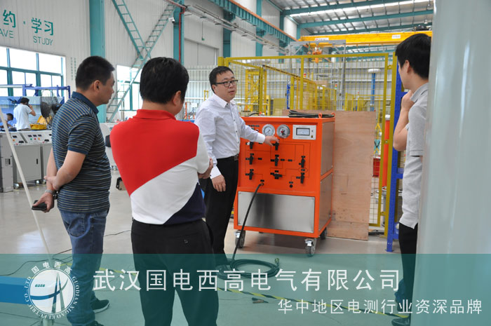 隨后客戶前往我司廠房對現(xiàn)有的SF6試驗設備樣品進行詳細的了解考察。由我司的技術人員詳細講解了SF6氣體回收裝置的試驗原理、操作以及技術參數(shù)等。