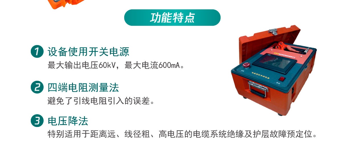 · 電壓降法特別適用于距離遠、線徑粗、高電壓的電纜系統(tǒng)絕緣及護層故障預定位;